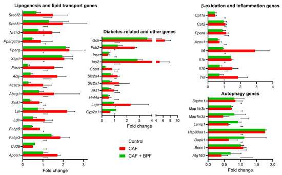 Differentially expressed hepatic genes in CAF and CAF + BPF groups when compared to control SC group. Fold change expression of selected lipogenesis and lipid transport (left), diabetes-related (center), β-oxidation, inflammation and autophagy-related transcripts (right) in CAF diet- and CAF + BPF-treated livers normalized to control (SC) livers. Data are presented as mean ± SD. See Section 2.