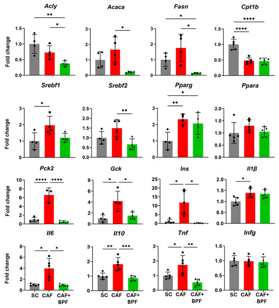 Differential expression of a subset of candidate regulated genes identified by RT2-PCR array approach was confirmed by individual qRT-PCR assays. This approach was useful to assess the biological variability lost by pooling RNAs, and to compensate for the limited number of technical replicas in RT2-PCR array analysis. The induction of lipogenesis genes in CAF rats was statistically significant for Srebf1 and Pparg, but not for Fasn, Acly and Acaca, when mRNA from four to five individual animals was separately analyzed (Figure 7). In addition, the CAF diet caused a dramatic upregulation in Gck, Pck2, Ins genes and a significant increase in Il6, Il10, Tnf and Il1b compared to the SC group without affecting Srebf2, Ppara and Infg genes (Figure 7), which showed a similar trend as observed in array analysis (Figure 6). In line with the array data, a marked downregulation in the majority of lipogenesis- and diabetes-related genes (Pck2, Gck and Ins) as well as in cytokines was observed in BPF-treated livers compared to both CAF and SC groups (Figure 7). Interestingly, Fasn, Acaca, Acly, Pck2 and Ins were suppressed far below the mRNA levels of the control livers. Finally, the CAF diet significantly reduced Cpt1b expression and it was not upregulated in CAF + BPF livers, while another β-oxidation gene Ppara was unchanged (Figure 7). All the data presented as fold change in Figure 7 were also shown as Hrpt relative expression (Figure S1, Supplementary Materials).