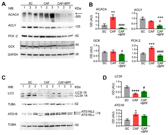 To verify the BPF-induced effects on gene expression, we performed a Western blot analysis of liver lysates for the most representative gene products. The increased ACACA and PCK2 protein levels in rats fed with CAF diet were reversed by BPF supplementation and in the case of ACACA were significantly reduced when compared with the SC group (Figure 8A,B). The CAF diet was not able to modulate the protein levels of ACLY and GCK enzymes in comparison to the SC diet, but BPF treatment significantly decreased it (Figure 8A,B). This finding contrasts with the highly elevated Gck mRNA in CAF livers (Figure 4B,C, Figure 6A and Figure 7), suggesting that not all significant transcriptional effects are mirrored by protein levels. Concerning the expression level of autophagy-related proteins, both LC3I and LC3II forms of LC3 were significantly reduced under CAF treatment when compared to the SC group (Figure 8C,D) and only autophagosome marker LC3II was significantly upregulated in the CAF + BPF group with respect to the CAF group. However, in contrast to RNA expression data in Figure 5, ATG16L was found to be slightly upregulated in the CAF group but not modulated in the CAF+ BPF group (Figure 8C,D).