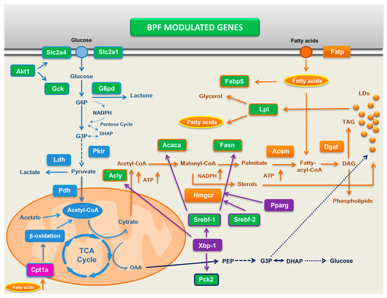 Schematic representation of main lipid- and glucose-metabolism genes differentially expressed in CAF + BPF-treated livers. Green rectangles: genes downregulated by BPF; pink rectangles: genes downregulated by CAF diet; light-blue rectangles and outlines: genes related to glucose metabolism; orange rectangles and outlines: genes related to lipid metabolism; violet rectangles and outlines: transcription factors coding genes; blue: intermediaries in gluconeogenesis pathway. Continuous and dotted arrows: direct and indirect connections, respectively.