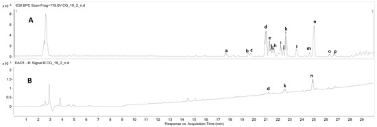 Figure 1. To screen secondary metabolites from the MeOH extract of C. gladiate, LC-QTOF MS/MS was conducted in negative mode. (A) Negative mode mass (MS) chromatogram. (B) Ultraviolet (UV; 254 nm) chromatogram of the methanol extract from C. gladiata.