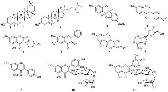 The methanolic extract from C. gladiate pods was fractionated utilizing organic solvents of increasing polarity: n-hexane, ethyl acetate, aqueous n-butanol, and the water layer, respectively. Eleven compounds (111) were separated through repeated column chromatography (CC) using silica gel, RP-18, and semi-preparative high-performance liquid chromatography (HPLC), as shown in Figure 2. Through a comparison of their spectroscopic data with the literature references using DeepSAT (https://deepsat.ucsd.edu/ (accessed on 30 December 2021)) [22], the chemical structure was identified as 3α-friedelinol (1) [23], β-sitosterol (2) [24], medicarpin (3) [25], formononetin (4) [26], sophorophenolone (5) [27], 7-hydroxy-6-methoxy dihydroflavonol (6), 2′-hydroxy biochanin A (7) [28], β-adenosine (8) [29], 5-methoxydaidzein (9) [30], rutin (10) [19], and myricetin 3-O-rutinoside (11) [31]. To our knowledge, this study is the first to document compounds 1, 2, 4, and 11 in sword bean (C. gladiata). Consequently, our research enhances the understanding of secondary metabolites and offers a scientific basis for the utilization of sword bean. However, this study only identifies the chemical components of the Korean sword bean. Further research is needed to investigate the secondary metabolites of the sword bean collected from various locations and seasons. This deeper evaluation of chemical profiling will help in exploring potential industrial applications. Furthermore, future studies should address additional optimization conditions for the extraction process or explore alternative extraction methods.