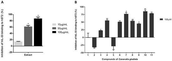 Figure 3. Assessing the inhibitory effect of extract and isolated compounds on IL-33/ST2 interaction using ELISA (enzyme-linked immunosorbent assay). ELISA results showing the repression of IL-33/ST2 interaction in (A) C. gladiata MeOH extract (10, 50, and 100 µg/mL). (B) Isolated compounds, 111 (100 µM). * p < 0.05, ** p < 0.01.