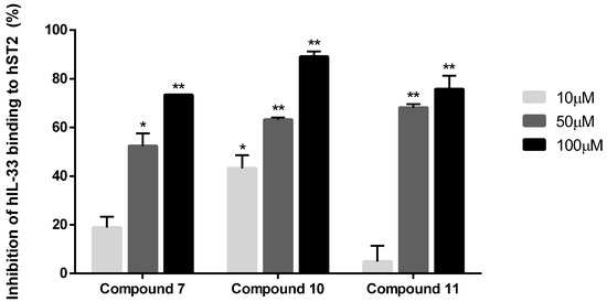 Figure 4. Evidence of the dose-dependent effects of compounds 7, 10, and 11 on IL-33 protein. * p < 0.05, ** p < 0.01.