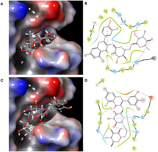 Figure 5. The crystal structure of the IL-33 and ST2 receptor complex (PDB ID: 4KC3) was obtained from the Protein Data Bank (http://www.rcsb.org (accessed on 20 October 2023)) for use in the molecular docking simulation. The protein’s conformation was optimized using the ‘Orthogonal Partial Least Squares 4’ (OPLS4) potential energy function and the protein preparation tool in Maestro v12.4 (Schrödinger, New York, NY, USA). Molecular docking for compounds 10 and 11 with 4KC3 protein: (A) Three-dimensional (3D) and (B) Two-dimensional (2D) docking simulation of the interactions between compound 10. (C) Three-dimensional (3D) and (D) Two-dimensional (2D) docking simulations of the interactions between compound 11. Compounds 10 and 11 have transparent surfaces on their ligand-binding pockets (left panels). The right panels depict interactions between the ligands and the protein’s amino acid residues, such as hydrogen bonds (pink) and pi–pi stacking interactions (green).
