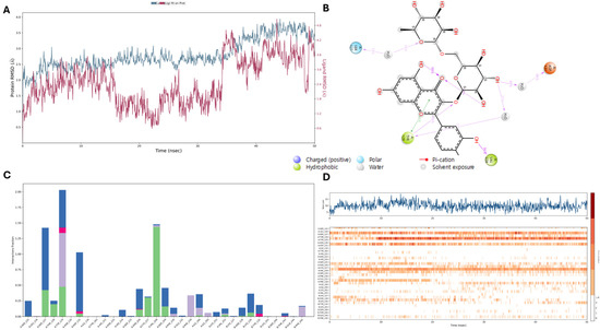 Similar to other reports [21], we conducted a molecular dynamics simulation to gain a better understanding of the interactions in the protein–ligand complex. The complex was prepared using the system builder tool. The solvent model employed was the simple point charge model used to mimic water molecules. The binding site of the protein–ligand complex was placed in an orthorhombic box with a distance of 10 Å in all directions and then minimized for volume. To neutralize the entire system, Na+ ions were added, and the salt concentration was set to 0.15 M using Na+ as the positive ion and Cl− as the negative ion. The OPLS4 force field was chosen to minimize the energy of the complex. Molecular dynamics simulations were carried out with the isothermal–isobaric (NPT) ensemble at 300 K and 1.01325 bars. Temperature and pressure were maintained using the Nosé–Hoover chain thermostat method and the Martyna–Tobias–Klein barostat method, respectively. The simulation ran for 50 ns with a recording interval of 50 ps. The entire model system was equilibrated before the simulation. The results of the molecular dynamics simulation were analyzed using the simulation interaction diagram tool in Maestro v12.4.