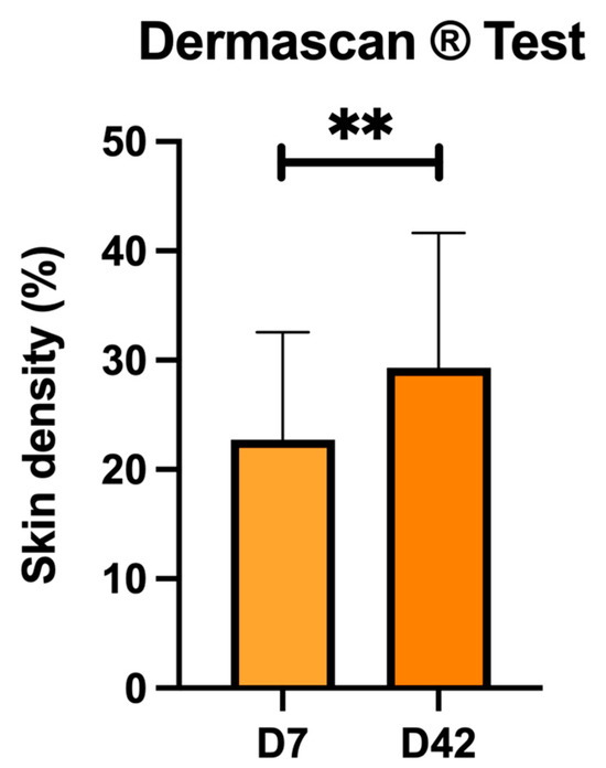 Results of the skin density of the subjects in the baseline situation (D7) and after treatment with CBL (D42) using the Dermascan® device. The parameter evaluated is the proportion of nonechogenic tissue (skin density %). Values are mean ± SD. Forty subjects (n = 40) were analyzed. ** p < 0.01 with respect to baseline (D7).
