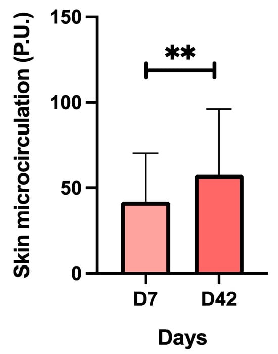 Results of the skin microcirculation of the subjects in the baseline situation (D7) and after treatment with CBL (D42) using the laser–Doppler technique. Values are mean ± SD. Forty subjects (n = 40) were analyzed. ** p < 0.01 with respect to baseline (D7).