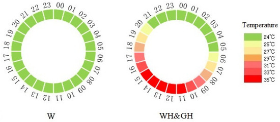 Light and temperature conditions for white light (W) group, white light with heat stress treatment (WH) group, and green light with heat stress treatment (GH) group. Numbers outside the circle represent time, and different colours of the circle indicate the temperature. In the W group, the daily ambient temperature was maintained at 24 °C, while in the WH and GH groups, the daily temperature was gradually increased to 35 °C from 06:00 to 11:00, maintained for 5 h, and then gradually decreased to 24 °C.