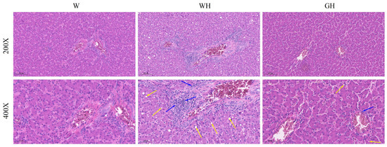 Upon morphological analysis post-H&E staining (Figure 2), hepatocytes in the W and GH groups exhibited a neatly arranged structure with clear boundaries, uniform cytoplasm, and a pink colouration. The hepatic cords were distinctly delineated and arranged in a scattered pattern. Conversely, in the WH group, hepatic cord arrangement was disrupted, and the cytoplasm appeared light pink and uneven. Further histopathological examination revealed inflammatory cell infiltration and aggregation (marked with blue arrows) around blood vessels in the livers of geese in the WH group. In contrast, the W and GH groups showed minimal inflammatory cell infiltration. Additionally, numerous round vacuoles of varying sizes were observed in the WH group (marked with yellow arrows).