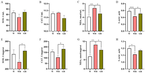 The activities of antioxidant enzymes (SOD and CAT), levels of MDA, and the T-AOC in both serum and liver are depicted in Figure 3. Comparison between the W and WH groups revealed that cyclic chronic HS significantly (p < 0.01) increased MDA levels in both serum and liver, while T-AOC significantly (p < 0.05) decreased in the WH group. However, exposure to green light significantly (p < 0.05) reduced serum and liver MDA levels compared to the WH group, accompanied by enhanced serum T-AOC, liver SOD, and CAT activity (p < 0.05). No significant differences were observed in SOD and CAT activity, MDA levels, and T-AOC in both serum and liver between the W and GH groups.
