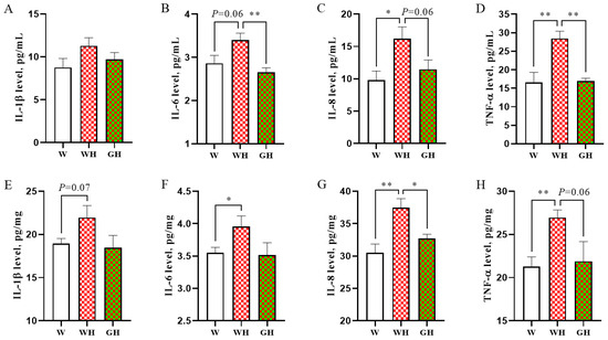 In Figure 4, the inflammatory parameters in both serum and liver are delineated. Comparison between the W and WH groups revealed a significant increase in serum IL-8 (p < 0.05) and TNF-α levels (p < 0.01) due to cyclic chronic HS, with IL-6 levels showing a tendency to increase. Notably, in the liver, IL-8 and TNF levels exhibited the most significant increases (p < 0.01), followed by IL-6 levels (p < 0.05). Transitioning from white light under HS to green light resulted in varied degrees of decrease in IL-6, IL-8, and TNF-α levels in both serum and liver, with the reductions in serum IL-6 and TNF-α being the most prominent (p < 0.01). No significant differences were observed between the W and GH groups for these parameters.