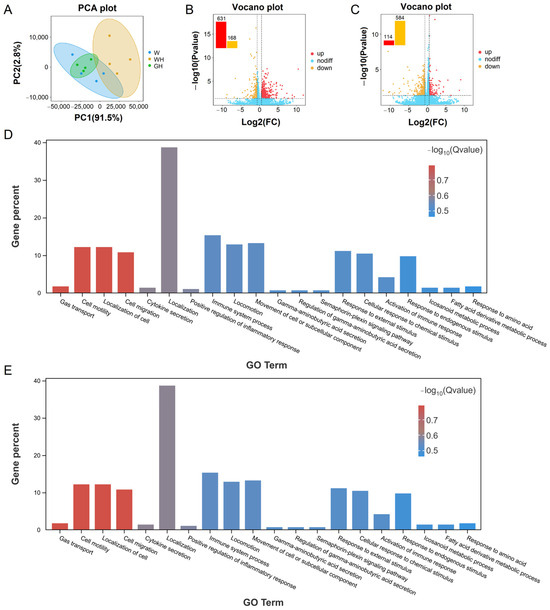 PCA results demonstrated a significant separation between the W and WH groups, as well as between the WH and GH groups (Figure 5A). Further analysis revealed 799 DEGs between the W and WH groups, comprising 631 up-regulated and 168 down-regulated genes (Figure 5B). Similarly, 698 DEGs (114 up-regulated and 584 down-regulated) were identified in the WH and GH groups (Figure 5C).