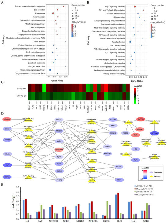 Potential pathway analysis of green light in regulating liver heat stress responses. (A) Top 20 significantly enriched KEGG pathways of DEGs in comparison between W and WH groups. (B) Top 20 significantly enriched KEGG pathways of the DEGs in comparison between WH and GH groups. (C) Heatmap of Log2(FC) of 28 DEGs related to immunity and inflammation presented in top 20 pathways in both comparisons. (D) Gene–pathway network diagram in the comparison of WH and GH groups. Blue and red ellipses represent significantly up-regulated genes (log2FC > 0.585, p < 0.05) and down-regulated genes (log2FC < 20.585, p < 0.05), respectively; yellow triangles represent pathways. (E) Validation of the gene expression profile by qRT PCR (n = 8).