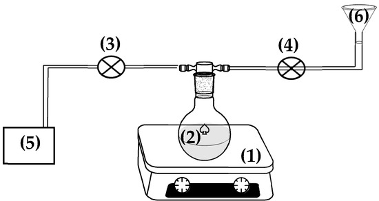 Schematic presentation of handmade apparatus used for the preparation of the CV@NZ nanohybrids: (1) stirrer with a heating plate, (2) spherical glass flask, (3) security valve of the pump, (4) security valve of the CV tank, (5) air vacuum pump, and (6) CV tank. CV: carvacrol and NZ: natural zeolite.
