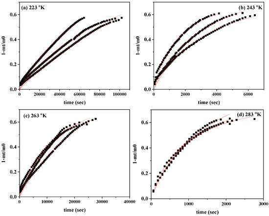 CV desorption isotherm kinetic plots of the CV@NZ nanohybrid at (a) 223 °K, (b) 243 °K, (c) 263 °K, and (d) 283 °K. The red lines show the simulation plots according to the pseudo-second order kinetic model. CV: carvacrol and NZ: natural zeolite.