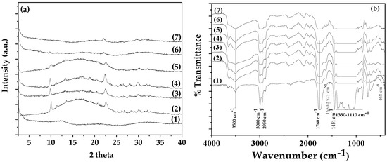 (a) XRD and (b) FTIR plots of the films: (1) PLA/TEC, (2) PLA/TEC/5NZ, (3) PLA/TEC/10NZ, (4) PLA/TEC/15NZ, (5) PLA/TEC/5CV@NZ, (6) PLA/TEC/10CV@NZ, and (7) PLA/TEC/15CV@NZ. PLA: poly-lactic acid, TEC: triethyl citrate, CV: carvacrol, and NZ: natural zeolite.
