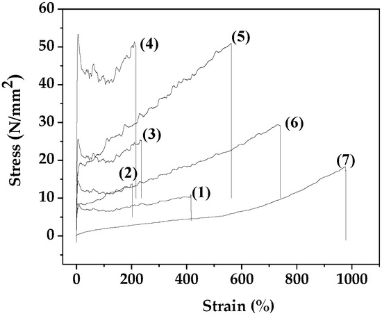The stress–strain curves of all PLA/TEC/xNZ and PLA/TEC/xCV@NZ films as well as the pure PLA/TEC film are plotted in Figure 7. From these stress–strain curves, the Elastic Modulus (E) values, the ultimate strength (σuts) values, and the % elongation at break (%ε) values were calculated and are listed in Table 3 for comparison. Independent sample median tests and pairwise comparisons of the different treatments according to the mean values of E, σuts, and %ε are shown in Figure S1 and Table S1, respectively.