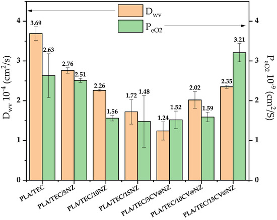The oxygen transmission rate (OTR) values of all obtained PLA/TEC/xNZ and PLA/TEC/xCV@NZ films as well as the PLA/TEC film were measured by using an oxygen permeation analyzer (O.P.A., 8001, Systech Illinois Instruments Co., Johnsburg, IL, USA). Three films of each sample with an average diameter of 11 cm and a thickness of 0.05–0.11 mm were placed in the oxygen analyzer chamber and measured at 23 °C and 0% RH according to the ASTM D 3985 method. After the end of each measurement, each sample was cut into three pieces, and the thickness was measured at four points for each piece. Thus, the thickness of each film was determined by twelve different points, and the average value of thickness was calculated. This mean value was used to transform the obtained OTR values to oxygen diffusion coefficient (PO2) values using the methodology previously described [52].