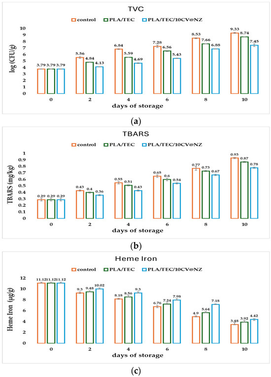 Minced pork from the hind leg, in portions of approximately 70–80 g each, were aseptically wrapped between two films of PLA/TEC and PLA/TEC10CV@NZ samples that were 11 cm in diameter and placed inside the Aifantis company’s commercial wrapping paper without the inner film (coated with plasticized PVC). For the control sample, 80–90 g of minced pork was aseptically wrapped in the commercial opaque packaging paper (without removing the inner coated PVC film) from the Aifantis company. For all tested packaging systems, samples for the 2nd, 4th, 6th, 8th, and 10th day of preservation were prepared and stored under dark refrigerator conditions at 4 ± 1 °C (LG GC-151SA, Weybridge, UK). Every two days until the 10th day of storage, lipid oxidation, heme iron content, total viable count, and sensory analysis scores were determined for every packaging treatment.
