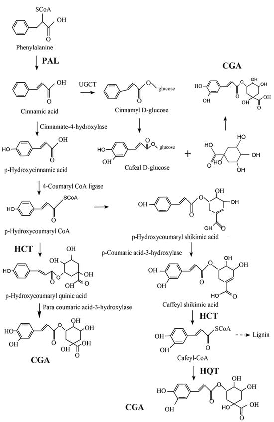 Three possible pathways for the biosynthesis of chlorogenic acid (CGA), adapted from Wang et al. [25]. HCT: quinic acid hydroxyl cinnamyl transferase; HQT: quinic acid cinnamate hydroxyl transferase; and PAL: phenylalanine-ammonia-lyase.