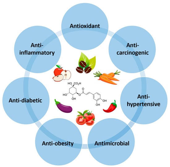 CGA, a secondary metabolite of higher plants, has gained a lot of attention for its numerous health benefits, including antioxidant, anti-inflammatory, anticarcinogenic, antihypertensive, antidiabetic, anti-obesity, and antimicrobial activities (Figure 2). These health-promoting effects of CGAs are mainly attributed to their ability to combat oxidative stress by scavenging free radicals, acting as a metal chelator, reducing lipid peroxidation, and inhibiting NADPH oxidase activity [32].