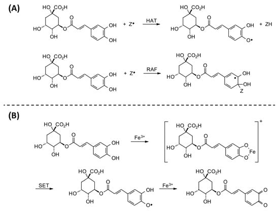 Reaction mechanisms for (A) possible radical scavenging activity and (B) iron-chelating ability of chlorogenic acid (CGA).