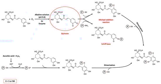 In principle, covalent interaction between proteins and phenolic acids can be achieved using various chemical approaches, including alkaline, free radical, and enzymatic methods. However, only a few of these methods are widely used in protein–CGA conjugates and suitable for large-scale production.