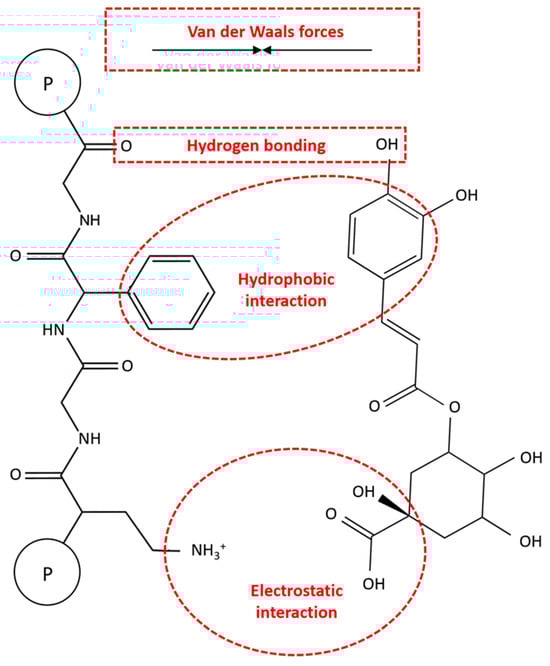 Non-covalent interactions involve weak intermolecular forces like hydrogen bonding, hydrophobic interactions, van der Waals forces, and electrostatic interactions. These interactions are reversible and lack the formation of chemical bonds, primarily occurring between the amino groups of proteins and the hydroxyl groups of CGAs (Figure 5). These reversible interactions are more studied than their irreversible ones due to the challenges in quantitating covalent bonds between molecules [16].