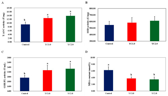The effect of YC supplementation on serum antioxidant capacity of laying hens. (A) is total antioxidant capacity (TOC) activity, (B) is superoxide dismutase (SOD) activity, (C) is glutathione peroxidase (GSH-PX) activity, and (D) is malondialdehyde (MDA) content. a,b Labels in a row, the differences are significant (p < 0.05); labels containing the same lowercase letters or no letters, the differences are not significant (p > 0.05).