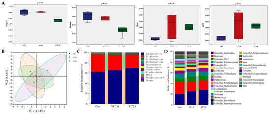 The effect of YC supplementation to diet on cecal microbiota of laying hens. (A) is the box plots of α diversity index. (B) is Principal Coordinate Axis Analysis (PCoA) two-dimensional sorting diagram. (C) is the relative abundance of cecal microflora at phylum level. (D) is the relative abundance of cecal microflora at genus level.