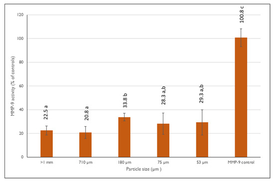 MMP-9 inhibitory activity as a percentage (%) of controls for the different PPF fractions. The data shown are mean values (n = 3) followed by an alphabet letter (for comparison between the different granulometric fractions). Different letters mean significantly different results (Tukey’s HSD; p ≤ 0.05).