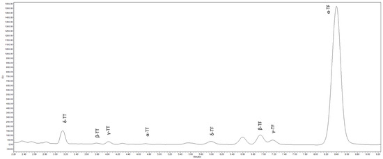UPLC-FLR chromatogram (at the excitation/emission wavelength of 290/330 nm) of tocopherols and tocotrienols identified in the PPF fractions. TT: tocotrienols; TF: tocopherols.