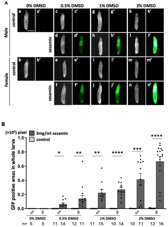 Observation of ARE-GFP fluorescence in the whole bodies of larvae fed sesamin. (A) Stereo fluorescence microscopy images of whole-body GFP fluorescence of ARE-GFP larvae. (a–n) are bright-field stereomicroscopic images of larvae, and (a’–n’) are fluorescence stereomicroscopic images of the same field of view. Green indicates ARE-GFP fluorescence. The fluorescence is stronger in the larvae fed sesamin (containing 2 mg/mL of sesamin and DMSO) than in the controls (DMSO). Scale bar is 1.0 mm. (B) Quantification of GFP-positive regions in whole ARE-GFP larvae. The numbers of male and female larvae used in this assay are noted at the bottom. The vertical axis of the graph shows the number of pixels of GFP-positive regions in the whole larval body. * p < 0.05, ** p < 0.01, *** p < 0.001, and **** p < 0.0001 with respect to Welch’s t-test. Bars indicate SEM.