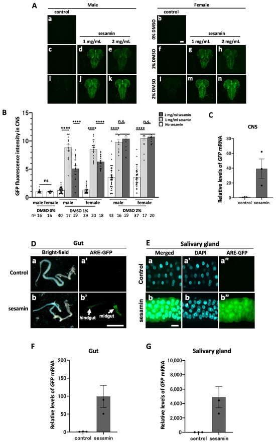 GFP fluorescence of ARE-GFP reporter in the larval CNS and digestion-related tissues and quantitation of GFP mRNA in the larvae fed sesamin. (A,D,E) Confocal fluorescence microscopy images of the CNSs (A), gut (D), and salivary glands (E) of ARE-GFP larvae. Note that intense GFP fluorescence was observed in the midgut and hindgut of the sesamin-fed larvae. Green indicates GFP fluorescence. The scale bars indicate 100 µm (A,E) or 1 mm (D). (B) Mean (relative) GFP fluorescence intensity in the CNS of ARE-GFP larvae. The vertical axis of the graph shows the relative values of the mean GFP fluorescence intensity in the CNSs of larval males reared on the diet without sesamin or DMSO, as a mean value of 1. (C,F,G) Relative expression levels of GFP in the CNS (C), gut (F), or salivary glands (G) in female larvae fed the diets supplemented with 1 mg/mL of sesamin (1% DMSO) (control, light-gray bars; sesamin-fed, dark-gray bars) were quantified using qRT-PCR. GFP mRNA levels increased from 39- to 4897-fold on average. (B) The numbers of male and female larvae used are noted at the bottom. (C,E,G); n = 3 (40 larvae/experiment, triplicates). n.s. = not significant and **** indicates p < 0.0001 in regard to Student’s t-test or Welch’s t-test. Bars indicate SEM.