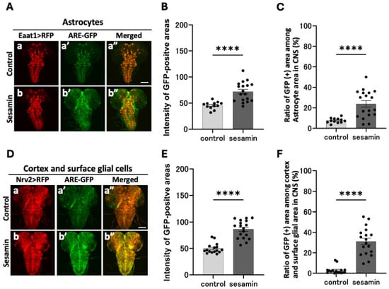 As previously mentioned, sesamin activates the Nrf2 transcription factor in glial cells within the larval CNS. Next, we investigated the types of glial cells in which Nrf2 is activated. Using the Gal4/UAS system, which allows ectopic gene expression, we performed the astrocyte (Figure 4A(a,b)), Eaat1-Gal4/ARE-GFP; UAS-RFP/+)- or cortex- and surface glia (Figure 4D(a,b), Nrv2-Gal4/ARE-GFP; UAS-RFP/+)-specific RFP labeling of the glial cells within the CNS. After feeding the larvae sesamin for 24 h, we examined whether the RFP fluorescence areas indicating each type of glial cell overlapped with those of the Nrf2-activated cells in the CNS. Greater GFP fluorescence was observed in the CNS of the sesamin-fed larvae (Figure 4A(b’)) than in the controls (Figure 4A(a’)). GFP fluorescence intensity in each glial cell region was quantified on a 0–255 scale. The average fluorescence intensity in the sesamin-fed larvae was 72.0 (57.4% increase); for comparison, it was 45.7 in the controls (Figure 4B). Similarly, in the cortex and surface glial regions, the average fluorescence intensity in the sesamin-fed group was 86.2 (73.2% increase, Figure 4D(b’),E), while it was 49.8 in the controls (Figure 4D(a’),E). As the fluorescence detected in the CNS of the controls was weak, we measured the sizes of the positive areas that expressed each glia marker with greater GFP fluorescence intensity than the average fluorescence intensity of the controls (which were not fed sesamin). The lower limit of the fluorescence threshold was set as the average fluorescence intensity of the controls (this threshold was 46–255 for astrocytes and 50–255 for cortex and surface glia). We observed greater GFP fluorescence in the sesamin-fed larvae than in the controls (Figure 4B). Moreover, we found that 23.8% of astrocytes in the sesamin-fed larvae emitted fluorescence, which is a 16.2% increase in the fluorescence-expressing area compared with that of the controls, for which the figure was 7.6% (Figure 4C). Among the cortex and surface glial cells of the sesamin-fed larvae, 31.1% of fluorescence-emitting regions were detected, which was a 28.2% increase when compared with the 2.9% detected in the controls (Figure 4F). These results indicate that sesamin consumption activates Nrf2 in astrocytes as well as in cortex and surface glial cells.