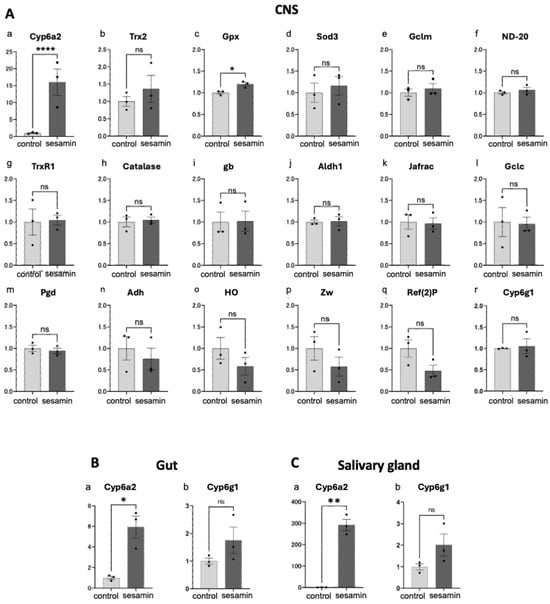 Quantification of mRNA for Nrf2-regulated genes in the CNSs and digestive-related tissues in larvae reared on sesamin. (A) Relative expression levels of each gene in larvae fed sesamin (control, light-gray bars, sesamin, dark-gray bars) were quantified using qRT-PCR. Total RNA was isolated from the CNSs (A), gut (B), or salivary glands (C) of larvae reared on diets containing 1 mg/mL sesamin and 1% DMSO, and those from larvae reared on diets containing 1% DMSO only as controls for 24 h. Cyp6a2 mRNA levels were significantly increased in the CNS, gut, and salivary glands in the larvae fed sesamin (n = 3). (ns, not significant; * p < 0.05; ** p < 0.01; and **** p < 0.0001 for Welch’s t-test). Bars indicate SEM.