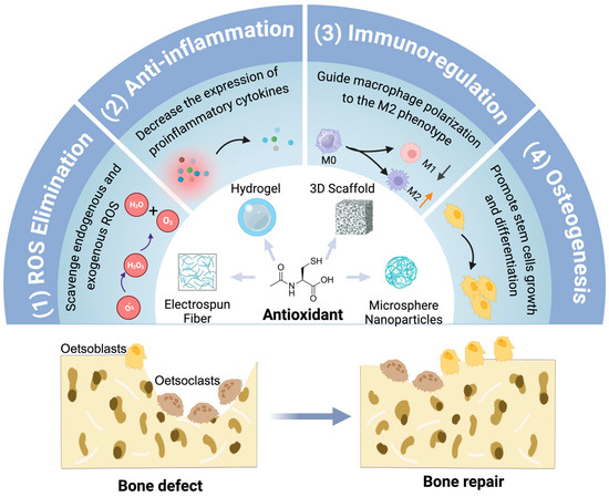 The effect of antioxidant-loaded biomaterial in bone repair. The combination of antioxidants and biomaterials can exert multi-targeted effects: (1) ROS scavenging; (2) anti-inflammation by decreasing the expression of proinflammatory cytokine; (3) immunoregulation by guiding macrophage polarization to the M2 phenotype; (4) osteogenesis by promoting the growth, proliferation, and differentiation of stem cells. The arrows in the figure indicate increasing (red) or decreasing (black). Created with BioRender.com (accessed on 17 June 2024).