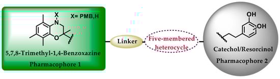 1,2-, 1,3-, and 1,4-benzoxazines are considered as one of the key classes of organic molecules endowed with a broad spectrum of biological activities [11,12]. More specifically, 1,4-benzoxazines represent a privileged scaffold in drug discovery due to their fascinating pharmacological profile [13,14]. They have been investigated as potential antimicrobial/antifungal [15,16,17,18,19,20], antioxidant [21,22,23,24,25,26], anti-infective [27], antidiabetic [28], or anticancer agents [29,30,31,32,33,34,35], as well as against neurodegenerative [36] and cardiovascular disorders [37,38]. In particular, the 5,7,8-trimethyl-1,4-benzoxazine moiety can be considered as a bioisostere of the 5,7,8-trimethyl-1,4-benzopyran nucleus [39,40] that is the key heterocycle moiety of the well-known chain-breaking antioxidant vitamin E. Calogeropoulou et al. were the first to synthesize a number of 5,7,8-trimethyl-1,4-benzoxazine derivatives endowed with an array of biological activities, specifically against arrhythmias associated with ischemia-reperfusion injury [41], against toxoplasmosis inhibiting the proliferation of Toxoplasma gondii tachyzoites [27], against prion diseases inhibiting the formation of PrPSc [42], and finally as modulators of the AtoSC two-component system mediated signaling [43]. Thus, as a continuation of our previous work, herein we employed the well-established medicinal chemistry approach of molecular hybridization [44] and synthesized six compounds combining the 5,7,8-trimethyl-1,4-benzoxazine scaffold and catechol or resorcinol moieties. The two pharmacophores are connected through the amide bond bioisostere of the 1,2,3-triazole heterocycle (Figure 1) [45].