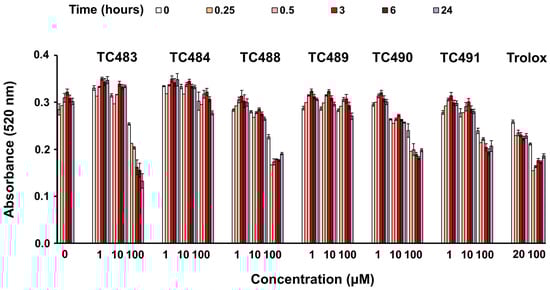 The six final compounds TC483, TC484, TC488, TC489, TC490, and TC491 were initially tested for their antioxidant capacity in a cell-free system, i.e., using the method of the free radical DPPH. As shown in Figure 2, four out of the six compounds were able to scavenge DPPH in a time- and concentration-dependent manner. The most active compounds seemed to be TC483 and TC488, which exhibited scavenging activity similar to the positive control (Trolox, 100 μM) at the highest concentration tested (100 μM). TC490 and TC491 were also effective DPPH scavengers, especially at 100 μM. The remaining two compounds, i.e., TC484 and TC489 were marginally active at 100 μM and only following incubation for 24 and 3 h, respectively.