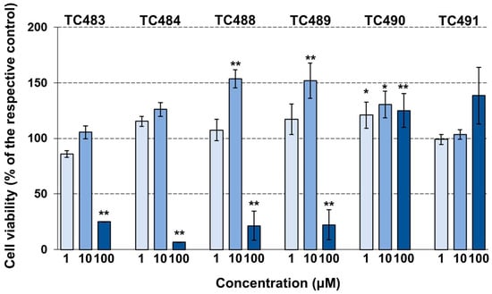 Then, the effect of the six compounds on the viability of human skin fibroblasts was assessed based on the widely accepted MTT method. As shown in Figure 3, all the compounds were not cytotoxic at 1 or 10 μM concentration. However, TC483, TC484, TC488, and TC489 were cytotoxic at the highest concentration tested, i.e., 100 μM. On the other hand, TC488 and TC489 increased cellular viability at 10 μM. However, testing viability with an alternative method (see Supplementary Materials, Figure S19) indicated no difference from the vehicle. TC490 was not cytotoxic at any concentration tested, and furthermore it mildly increased cellular viability. Finally, TC491 did not exhibit any statistically significant effect at any concentration tested.