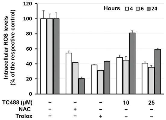Based on the above results, TC488 was considered as the most promising, since it was one of the most active radical scavengers (Figure 2) and at 10 μM it stimulated cell viability (Figure 3). Hence, it was further evaluated for its intracellular antioxidant activity by means of the DCFH-DA probe, which is internalized by the cells and upon oxidation by the cells’ reactive oxygen species (ROS) yields the highly fluorescent DCF. As shown in Figure 4, TC488 at both 10 μM and 25 μM and at early time-points (up to 6 h) suppressed the intracellular ROS levels of human skin fibroblasts at a level comparable to that of the potent antioxidants NAC and Trolox. At later time-points, ROS levels tend to recover to control levels, especially in the presence of 10 μM TC488.