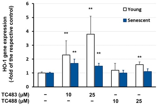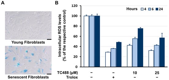 Interestingly, TC488 had similar effects on human skin fibroblasts that have been rendered senescent through repeated mild doses of ionizing radiation (stress-induced premature senescence; SIPS). In Figure 5A, the validation of cell senescence through SA-β-Gal staining is depicted. As shown in Figure 5B, despite the higher ROS levels that are characterizing senescent cells, TC488 had a dose-dependent antioxidant effect, interestingly comparable to those of the positive control Trolox.