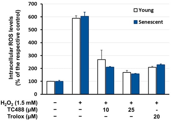 Reversal of oxidative-stress-induced ROS levels by TC488 in young and senescent human skin fibroblasts. Human skin fibroblasts were pre-treated for 3 h with the indicated concentrations of TC488 or 20 μM Trolox in serum-free medium, then DCFH-DA along with 1.5 mM H2O2 was added and fluorescence was monitored after 1 h, as described under Materials and Methods. Average of two independent experiments; error-bars represent standard deviation.