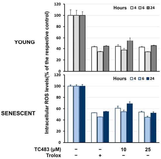 Intracellular ROS levels of young and senescent human skin fibroblasts in the presence of TC483. Cells were treated overnight with the indicated concentrations of TC483 or 20 μM Trolox in serum-free medium, then DCFH-DA was added and fluorescence was monitored at the indicated time-intervals, as described under Materials and Methods. Average of three independent experiments; error-bars represent standard deviation.