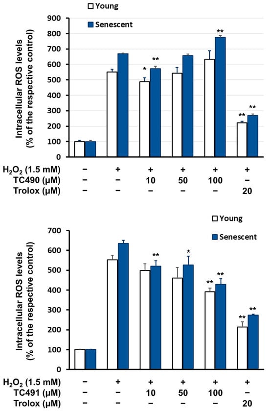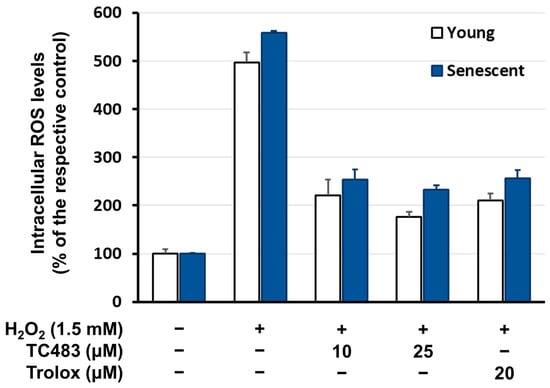 Besides TC488, analogue TC483 was also studied for its effects on the intracellular ROS levels of both young and senescent human skin fibroblasts, and it was found to suppress them at a level comparable to that of the positive control Trolox, with a slight tendency for recovery at 24 h (Figure 7). TC483 (like TC488) was also capable of reverting H2O2-induction of ROS in both young and senescent human skin fibroblasts (Figure 8).