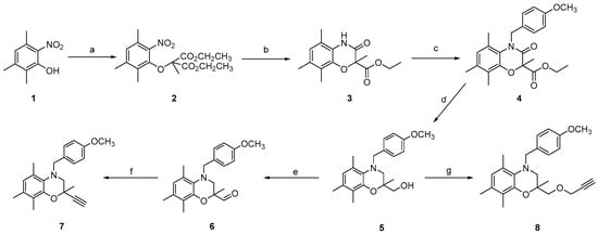 The synthesis of 5,7,8-trimethyl-1,4-benzoxazine analogues 19, 21, 22, 22a, 24, 26, and 26a bearing at position 2 a triazole ring is depicted in Scheme 1, Scheme 2, Scheme 3, Scheme 4 and Scheme 5. In particular, the synthesis of the 1,2,3-triazole-substituted benzoxazines 19, 20, 21, 23, and 25 was effected through a click reaction between alkyne 7 or 8 and azides 13, 14, 17, and 18. The required alkynes 7 and 8 were prepared as described in Scheme 1. Initially the required 5,7,8-trimethyl-benzoxazinone 3 was synthesized according to a previously reported method of our group [41] with modified reductive conditions [68]. Thus, alkylation of 2,3,5-trimethyl-6-nitrophenol (1) with 2-bromo-2-methylmalonic acid diethyl ester afforded analogue 2, which upon reduction using Na2S2O4 in EtOH:H2O (4:5 v/v) at 60 °C and spontaneous cyclization gave benzoxazinone 3. Then, N-alkylation using p-methoxybenzyl chloride in the presence of K2CO3 and a catalytic amount of TBAB gave compound 4, which was reduced by (CH3)2SBH3 in THF at 67 °C to the corresponding alcohol 5. Oxidation of 5 to the aldehyde 6 under Pfitzner–Moffatt conditions [69], followed by reaction with dimethyl (diazomethyl)phosponate (Bestmann–Ohira reagent) [70,71,72], generated in situ from dimethyl-1-diazo-2-oxopropylphosphonate by treatment with K2CO3 in CH3OH) led to the desired alkyne 7. Finally, alkyne 8 was obtained by alkylation of alcohol 5 with propargyl bromide in DMF using NaH as a base (Scheme 1).