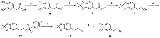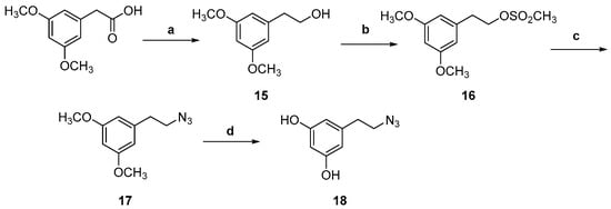 Azides 13, 14 and 17, 18 were synthesized from the commercially available (3,4-dihydroxyphenyl)acetic acid and (3,5-dimethoxylphenyl)acetic acid, respectively as described in Scheme 2 and Scheme 3. Briefly, esterification of (3,4-dihydroxyphenyl)acetic acid with methanol, in the presence of a catalytic amount of H2SO4 to the methyl ester 9 was followed by protection of the catechol moiety as the acetonide 10. Reduction of the ester in compound 10 with LiAlH4 to alcohol 11 followed by formation of the corresponding tosylate 12 [73] and reaction with NaN3 in DMF gave azide 13. TFA-mediated removal of the acetonide protecting group afforded the final azide 14 (Scheme 2). Reduction of (3,5-dimethoxylphenyl)acetic acid with LiAlH4 gave the corresponding alcohol 15, which was transformed to the respective mesylate ester 16 [74]. Reaction of 16 with NaN3 in DMF gave the corresponding azide 17 [74] in high yield (90%). Deprotection of the methoxy groups to obtain the desired analogue 18 was achieved by using BF3·S(CH3)2 complex in CH2Cl2 [73] (Scheme 3).