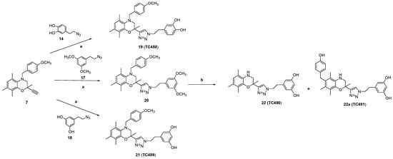 Following the synthesis of the desired alkynes (7, 8) and azides (13, 14, 17, and 18) 1,2,3-triazole-substituted benzoxazines were prepared regioselectively through a Cu1-catalyzed ‘click’ cycloaddition reaction [75,76]. The click reaction was carried out in the presence of CuSO4·5H2O and sodium ascorbate (NaAsc) in a mixture of CH2Cl2/H2O (1:1) under conventional conditions or tBuOH/H2O (1:1) under microwave-assisted irradiation, as shown in Scheme 4 and Scheme 5. Thus, the catecholic final product 19 (TC488) was obtained by the cycloaddition reaction of alkyne 7 and azide 14 at room temperature in 57% yield. In turn, click reaction between alkyne 7 and the protected azide 17 at room temperature afforded the 1,2,3-triazolyl derivative 20 in 67% yield. Deprotection of the methoxy groups in 20 using BF3S(Me)2 also resulted in the removal of the p-methoxybenzyl group affording compound 22 (TC490) in 35% yield. In addition, we obtained the byproduct derivative 22a (TC491) in 14% yield resulting from the migration of the p-hydroxybenzyl group from N-4 to C6 of the 5,7,8-trimethyl-1,4-benzoxazine system. Thus, in order to obtain the deprotected resorcinol derivative 21 (TC489) bearing the p-methoxybenzyl group at N-4 for structure activity studies, we successfully performed the cycloaddition reaction with alkyne 7 and the deprotected azide 18 and TC489 were isolated in 67% yield (Scheme 4).