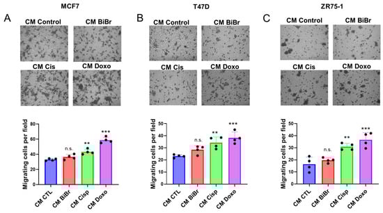 Conditioned media from DNA-damaging drugs increase motility in low-migrating epithelial breast cancer cells: (A–C) effect of CM on the migration of MCF-7, T47D, and ZR75-1 breast cancer cell lines. Data are shown as the mean ± SD of four independent experiments. ** p < 0.01, *** p < 0.001, vs. control (DMSO). n.s.: not significant.